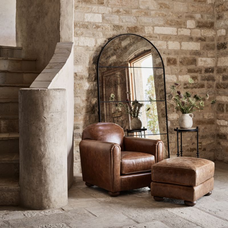 Our Navara floor mirror balances the modern with the traditional, outlining panes of antiqued mirrored glass with a clean black steel frame. The warm-toned mirror gives all reflections an intriguing heirloom quality, contrasting with the crisp, linear structure. Oversized and arched, this hand-finished floor mirror brings the drama while keeping things casual with a laid-back lean.