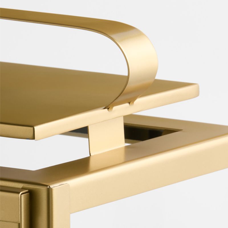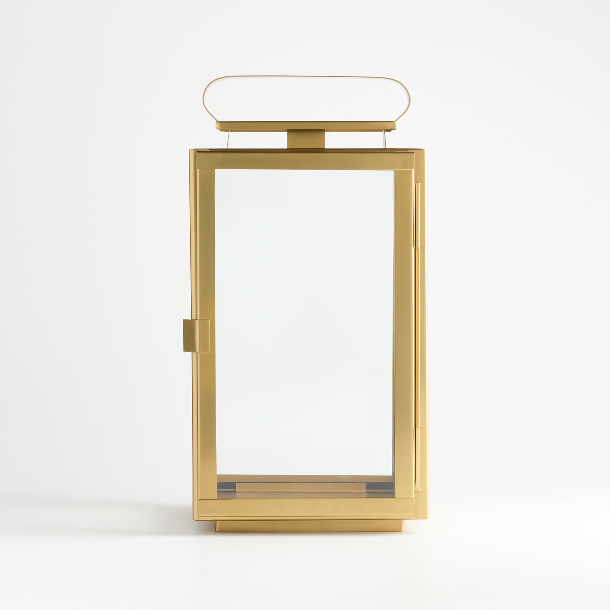 The classic iron lantern goes geometric and glam. A gleaming brass finish gives our bestselling Walker lantern the warm look of an heirloom. Panes of glass outlined in crisp golden frames protect pillar candles from breezes and air currents. An oblong handle offers curved contrast to the clean-lined lantern. Place one on either side of the fireplace mantel or group with our taller Walker lanterns for a dramatic candlelight display on the patio.